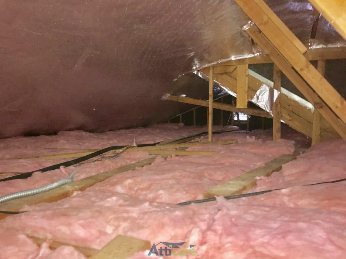 Atticare provided all the works for this attic. The old insulation was removed and completely cleaned out. Once it was completely clean the crew sanitized with 100% natural solution. Then they rodent proofed sealing all entry points that rodents might have access to. After this they placed a radiant barrier, radiant barriers are designed to reflect heat instead of absorbing it. Our crew also installed a QuietCool whole house fan, a ventilation system that will replace all of the hot air. A QuietCool will save you 50-90% on your A.C. related costs. Finally the crew installed brand new R-38 batts insulation. The home is now energy efficient.